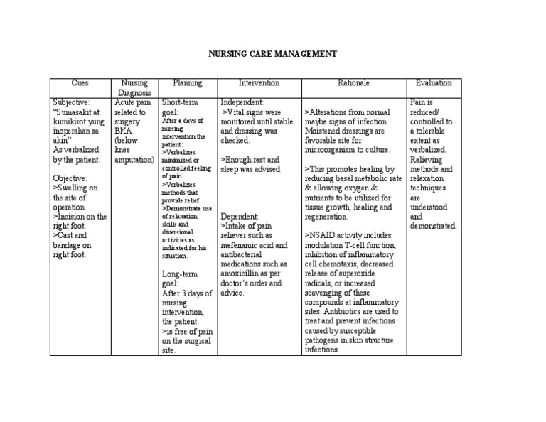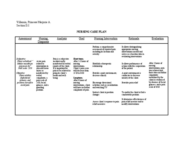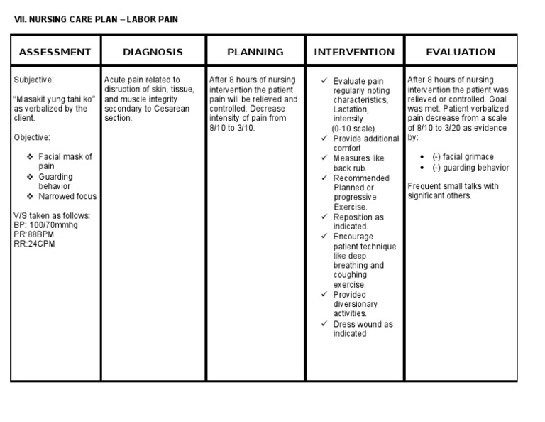 NCP for pain OB from imgv2-1-f.scribdassets.com Below is a nursing care plan for acute pain that includes a nursing diagnosis, interventions, and goals. Patient can experience acute pain due to many reasons. As a nursing diagnosis, acute pain is defined as an unpleasant emotional and sensory experience resulting from an actual or potential damage of a body tissue. The way it works is by distracting the client away from painful sensations through tactile stimuli. Pain is resolved or controlled. Warning pain, the discomfort or signal that alerts of something physically wrong in the body. Pain measurement quantifies pain intensity and enables the nurse to determine the efficacy of interventions aimed at reducing pain. Determine the characteristics of pain, for example;